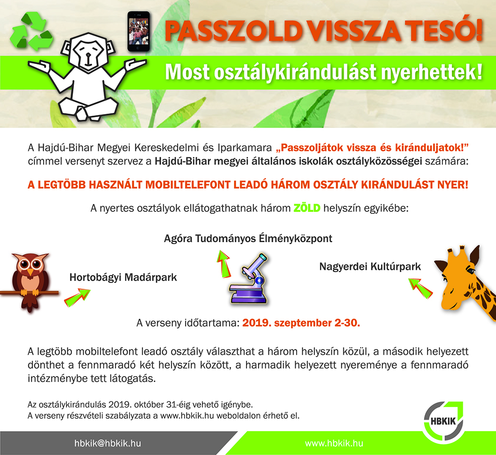 A Hajdú-Bihar Megyei Kereskedelmi és Iparkamara (HBKIK) „Passzoljátok vissza és kiránduljatok!” címmel versenyt szervez a Hajdú-Bihar megyei általános iskolák osztályközösségei számára: a legtöbb használt mobiltelefont leadó osztályok közül az első három helyezett osztálykirándulást nyer!